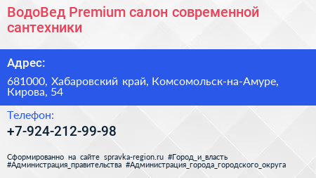 ВодоВед Premium, салон современной сантехники по адресу 681000, Хабаровский край, Комсомольск-на-Амуре, Кирова, 54 в дальнейшем Организация, размещена в следующих категориях: