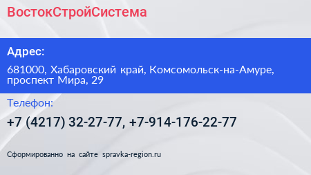 ВостокСтройСистема по адресу 681000, Хабаровский край, Комсомольск-на-Амуре, проспект Мира, 29 в дальнейшем Организация, размещена в следующих категориях: