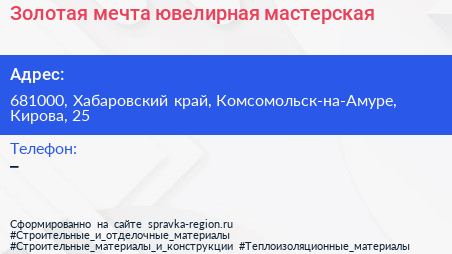 Золотая мечта, ювелирная мастерская по адресу 681000, Хабаровский край, Комсомольск-на-Амуре, Кирова, 25 в дальнейшем Организация, размещена в следующих категориях:
