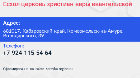 Есхол, церковь христиан веры евангельской по адресу 681017, Хабаровский край, Комсомольск-на-Амуре, Володарского, 39 в дальнейшем Организация, размещена в следующих категориях: