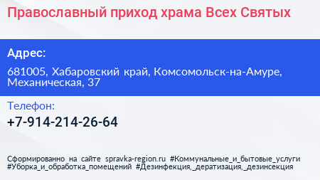 Православный приход храма Всех Святых по адресу 681005, Хабаровский край, Комсомольск-на-Амуре, Механическая, 37 в дальнейшем Организация, размещена в следующих категориях: