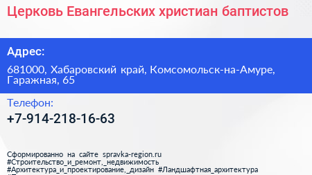 Церковь Евангельских христиан-баптистов по адресу 681000, Хабаровский край, Комсомольск-на-Амуре, Гаражная, 65 в дальнейшем Организация, размещена в следующих категориях: