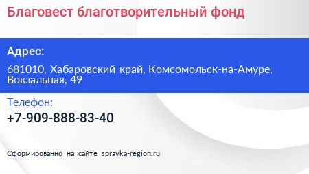 Благовест, благотворительный фонд по адресу 681010, Хабаровский край, Комсомольск-на-Амуре, Вокзальная, 49 в дальнейшем Организация, размещена в следующих категориях: