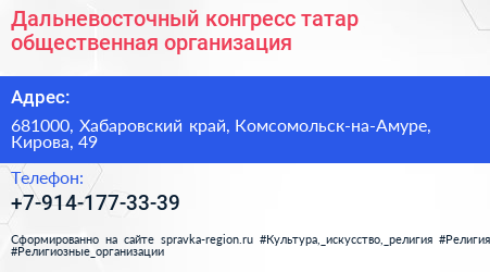 Дальневосточный конгресс татар, общественная организация по адресу 681000, Хабаровский край, Комсомольск-на-Амуре, Кирова, 49 в дальнейшем Организация, размещена в следующих категориях: