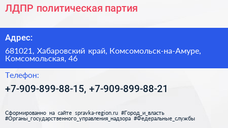 ЛДПР, политическая партия по адресу 681021, Хабаровский край, Комсомольск-на-Амуре, Комсомольская, 46 в дальнейшем Организация, размещена в следующих категориях: