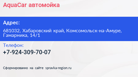 AquaCar, автомойка по адресу 681032, Хабаровский край, Комсомольск-на-Амуре, Гамарника, 14/1 в дальнейшем Организация, размещена в следующих категориях:
