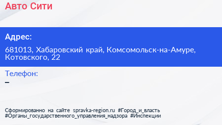 Авто Сити по адресу 681013, Хабаровский край, Комсомольск-на-Амуре, Котовского, 22 в дальнейшем Организация, размещена в следующих категориях:
