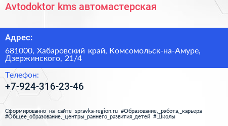 Avtodoktor kms, автомастерская по адресу 681000, Хабаровский край, Комсомольск-на-Амуре, Дзержинского, 21/4 в дальнейшем Организация, размещена в следующих категориях: