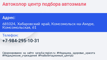 Автоколор, центр подбора автоэмали по адресу 681024, Хабаровский край, Комсомольск-на-Амуре, Комсомольская, 61 в дальнейшем Организация, размещена в следующих категориях: