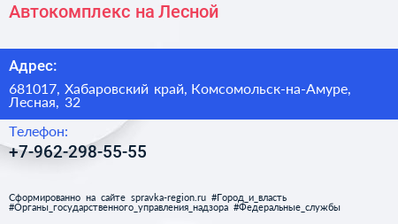 Автокомплекс на Лесной по адресу 681017, Хабаровский край, Комсомольск-на-Амуре, Лесная, 32 в дальнейшем Организация, размещена в следующих категориях: