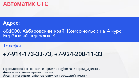 Автоматик, СТО по адресу 681000, Хабаровский край, Комсомольск-на-Амуре, Берёзовый переулок, 4 в дальнейшем Организация, размещена в следующих категориях: