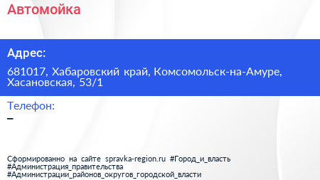 Автомойка по адресу 681017, Хабаровский край, Комсомольск-на-Амуре, Хасановская, 53/1 в дальнейшем Организация, размещена в следующих категориях: