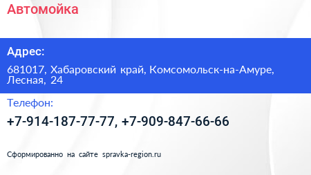 Автомойка по адресу 681017, Хабаровский край, Комсомольск-на-Амуре, Лесная, 24 в дальнейшем Организация, размещена в следующих категориях: