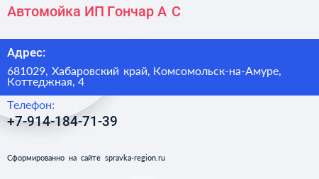 Автомойка, ИП Гончар А.С. по адресу 681029, Хабаровский край, Комсомольск-на-Амуре, Коттеджная, 4 в дальнейшем Организация, размещена в следующих категориях: