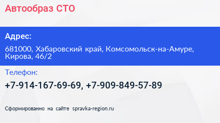 Автообраз, СТО по адресу 681000, Хабаровский край, Комсомольск-на-Амуре, Кирова, 46/2 в дальнейшем Организация, размещена в следующих категориях:
