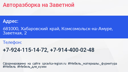 Авторазборка на Заветной по адресу 681000, Хабаровский край, Комсомольск-на-Амуре, Заветная, 2 в дальнейшем Организация, размещена в следующих категориях:
