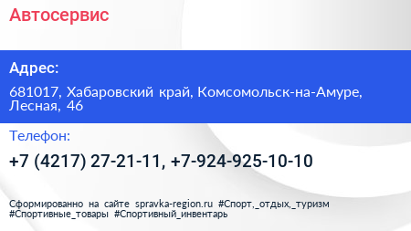 Автосервис по адресу 681017, Хабаровский край, Комсомольск-на-Амуре, Лесная, 46 в дальнейшем Организация, размещена в следующих категориях: