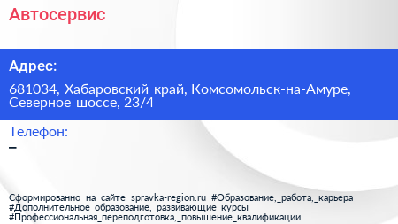 Автосервис по адресу 681034, Хабаровский край, Комсомольск-на-Амуре, Северное шоссе, 23/4 в дальнейшем Организация, размещена в следующих категориях: