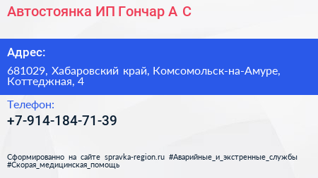 Автостоянка, ИП Гончар А.С. по адресу 681029, Хабаровский край, Комсомольск-на-Амуре, Коттеджная, 4 в дальнейшем Организация, размещена в следующих категориях: