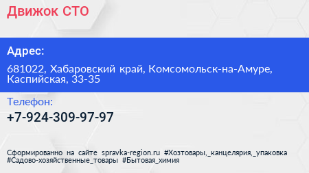 Движок, СТО по адресу 681022, Хабаровский край, Комсомольск-на-Амуре, Каспийская, 33-35 в дальнейшем Организация, размещена в следующих категориях: