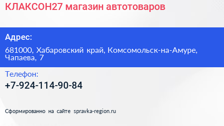 КЛАКСОН27, магазин автотоваров по адресу 681000, Хабаровский край, Комсомольск-на-Амуре, Чапаева, 7 в дальнейшем Организация, размещена в следующих категориях: