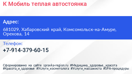 К.Мобиль, теплая автостоянка по адресу 681029, Хабаровский край, Комсомольск-на-Амуре, Орехова, 14 в дальнейшем Организация, размещена в следующих категориях: