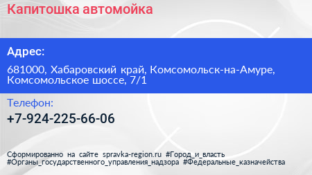 Капитошка, автомойка по адресу 681000, Хабаровский край, Комсомольск-на-Амуре, Комсомольское шоссе, 7/1 в дальнейшем Организация, размещена в следующих категориях:
