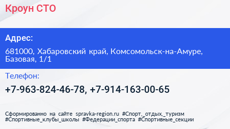 Кроун, СТО по адресу 681000, Хабаровский край, Комсомольск-на-Амуре, Базовая, 1/1 в дальнейшем Организация, размещена в следующих категориях: