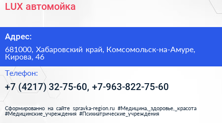 LUX, автомойка по адресу 681000, Хабаровский край, Комсомольск-на-Амуре, Кирова, 46 в дальнейшем Организация, размещена в следующих категориях: