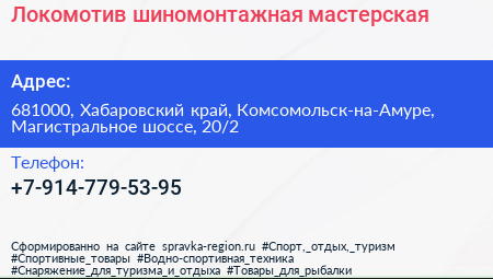 Локомотив, шиномонтажная мастерская по адресу 681000, Хабаровский край, Комсомольск-на-Амуре, Магистральное шоссе, 20/2 в дальнейшем Организация, размещена в следующих категориях: