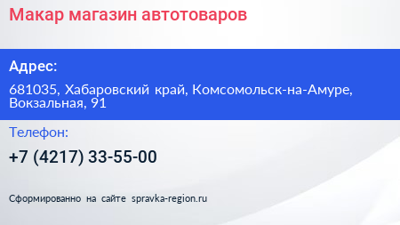 Макар, магазин автотоваров по адресу 681035, Хабаровский край, Комсомольск-на-Амуре, Вокзальная, 91 в дальнейшем Организация, размещена в следующих категориях: