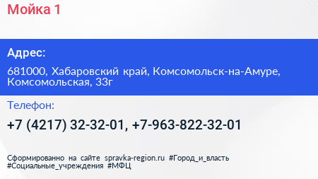 Мойка №1 по адресу 681000, Хабаровский край, Комсомольск-на-Амуре, Комсомольская, 33г в дальнейшем Организация, размещена в следующих категориях: