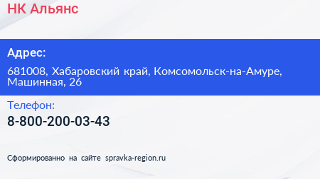 НК Альянс по адресу 681008, Хабаровский край, Комсомольск-на-Амуре, Машинная, 26 в дальнейшем Организация, размещена в следующих категориях: