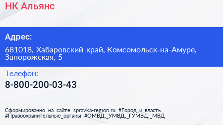 НК Альянс по адресу 681018, Хабаровский край, Комсомольск-на-Амуре, Запорожская, 5 в дальнейшем Организация, размещена в следующих категориях: