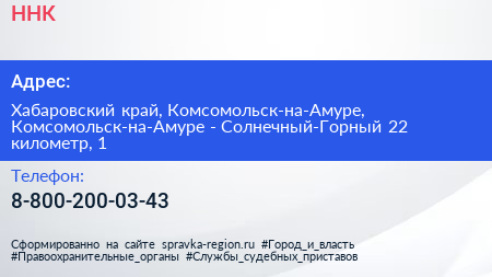 ННК по адресу Хабаровский край, Комсомольск-на-Амуре, Комсомольск-на-Амуре - Солнечный-Горный 22 километр, 1 в дальнейшем Организация, размещена в следующих категориях: