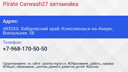 Pirate Carwash27, автомойка по адресу 681010, Хабаровский край, Комсомольск-на-Амуре, Вокзальная, 58 в дальнейшем Организация, размещена в следующих категориях: