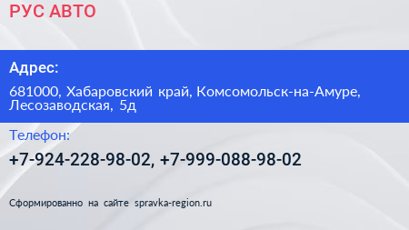 РУС АВТО по адресу 681000, Хабаровский край, Комсомольск-на-Амуре, Лесозаводская, 5д в дальнейшем Организация, размещена в следующих категориях: