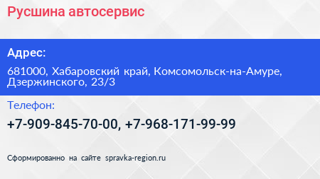 Русшина, автосервис по адресу 681000, Хабаровский край, Комсомольск-на-Амуре, Дзержинского, 23/3 в дальнейшем Организация, размещена в следующих категориях: