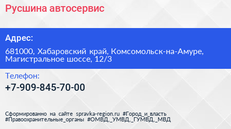 Русшина, автосервис по адресу 681000, Хабаровский край, Комсомольск-на-Амуре, Магистральное шоссе, 12/3 в дальнейшем Организация, размещена в следующих категориях:
