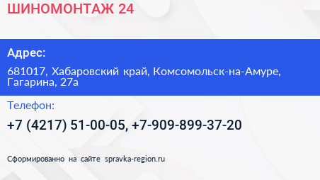 ШИНОМОНТАЖ 24 по адресу 681017, Хабаровский край, Комсомольск-на-Амуре, Гагарина, 27а в дальнейшем Организация, размещена в следующих категориях: