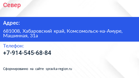 Север по адресу 681008, Хабаровский край, Комсомольск-на-Амуре, Машинная, 31а в дальнейшем Организация, размещена в следующих категориях: