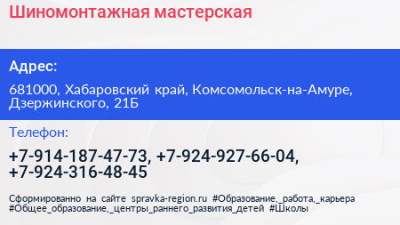 Шиномонтажная мастерская по адресу 681000, Хабаровский край, Комсомольск-на-Амуре, Дзержинского, 21Б в дальнейшем Организация, размещена в следующих категориях: