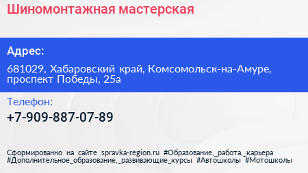 Шиномонтажная мастерская по адресу 681029, Хабаровский край, Комсомольск-на-Амуре, проспект Победы, 25а в дальнейшем Организация, размещена в следующих категориях: