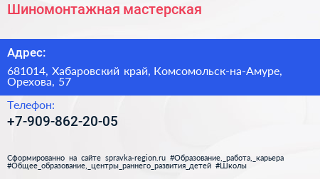 Шиномонтажная мастерская по адресу 681014, Хабаровский край, Комсомольск-на-Амуре, Орехова, 57 в дальнейшем Организация, размещена в следующих категориях: