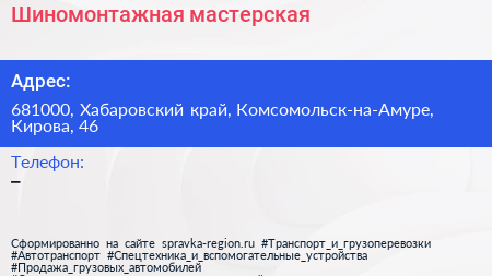 Шиномонтажная мастерская по адресу 681000, Хабаровский край, Комсомольск-на-Амуре, Кирова, 46 в дальнейшем Организация, размещена в следующих категориях: