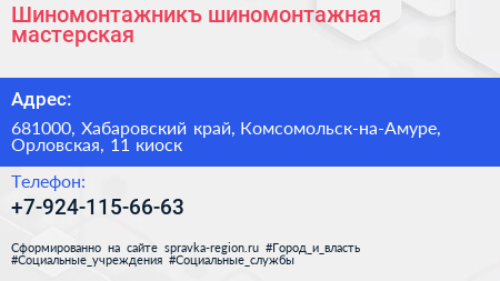 Шиномонтажникъ, шиномонтажная мастерская по адресу 681000, Хабаровский край, Комсомольск-на-Амуре, Орловская, 11 киоск в дальнейшем Организация, размещена в следующих категориях: