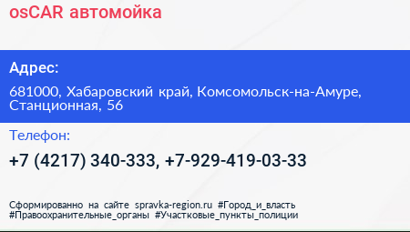 osCAR, автомойка по адресу 681000, Хабаровский край, Комсомольск-на-Амуре, Станционная, 56 в дальнейшем Организация, размещена в следующих категориях: