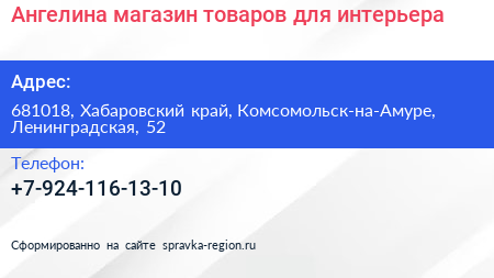 Ангелина, магазин товаров для интерьера по адресу 681018, Хабаровский край, Комсомольск-на-Амуре, Ленинградская, 52 в дальнейшем Организация, размещена в следующих категориях: