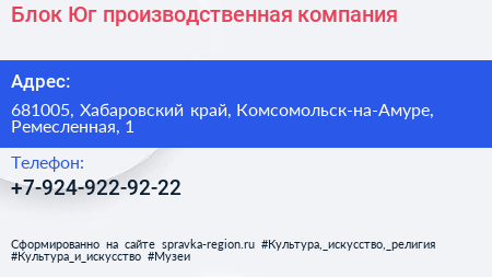Блок-Юг, производственная компания по адресу 681005, Хабаровский край, Комсомольск-на-Амуре, Ремесленная, 1 в дальнейшем Организация, размещена в следующих категориях: