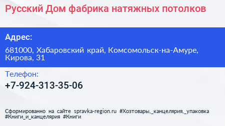 Русский Дом, фабрика натяжных потолков по адресу 681000, Хабаровский край, Комсомольск-на-Амуре, Кирова, 31 в дальнейшем Организация, размещена в следующих категориях: